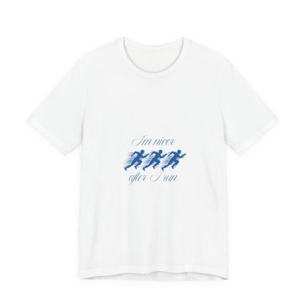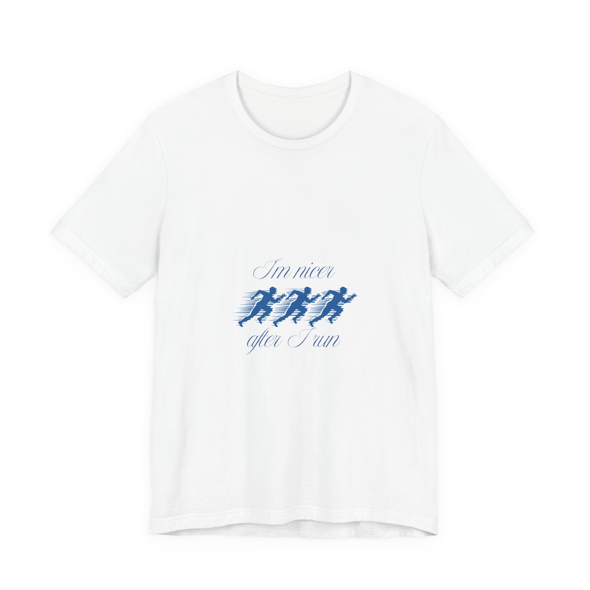 Lightweight, breathable jersey tee with a relaxed retail fit and a subtle running-themed front print. The soft Airlume combed and ring-spun cotton feels cool against the skin during training runs or laid-back weekends. Clean crew neckline and side seams keep the silhouette neat, while shoulder tape and a ribbed knit collar maintain shape through frequent wear. The design’s distressed blue runners and cursive line — “I’m nicer after I run” — reads like a quiet promise to yourself: fresh air, moving feet, and a reset. It layers easily under jackets for chilly mornings and stands out on its own during post-run coffee runs or casual meetups.